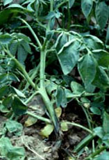Широко распространенная болезнь картофеля. Вызывается бактериями рода Pectobacterium, перезимовывающими в почве или в больных клубнях. Возбудитель черной ножки может поражать широкий круг растений-хозяев, среди которых много сорных растений. Оптимальная температура - 21-26oC, но может развиваться в самом широком диапазоне температур от 2 до 32 оС. Источник инфекции - пораженные растительные остатки в почве и на ее поверхности (в которых паразит может сохраняться до 2 лет), а также больные клубни. Внешне здоровые клубни из-под пораженных кустов могут содержать в себе скрытую инфекцию, развитие которой начнется при благоприятных условиях. Болезнь может распространяться и личинками насекомых. Поражает как надземную, так и подземную части растения во всех фазах его развития. Проявляется в виде поражения прикорневой части стеблей во время вегетации ("черная ножка") и загнивания клубней ("мягкая гниль") в поле и при хранении. При медленном течении болезни (в сухих условиях) она носит хронический характер. Больные растения обнаруживаются вскоре после появления всходов. Листья желтеют, свертываются в трубочку и засыхают. Стебель также желтеет и увядает. При быстром развитии болезни (наблюдается в жаркую погоду при высокой влажности) уже через 4-6 дней после поражения почерневшая часть больного стебля размягчается, он надламывается, не выдерживая собственного веса. Растения, пораженные черной ножкой, легко выдергиваются из почвы - это отличает "Черную ножку" от Ризоктониоза. На поперечных срезах стеблей заметно побурение сосудистых пучков. При помещении конца стебля в воду заметно выделение слизи. Иногда у растений поражаются один или несколько стеблей. На пораженных клубнях симптомы заболевания проявляются в виде темной гнили, начинающейся , как правило, в столонной части. Проникая из стеблей через столоны в дочерние клубни, бактерии распространяются до середины и превращают ее в мягкую гниющую массу. Окраска пораженных частей клубня вначале светлая, потом темнеет. Отличительная особенность больных клубней - потемневшая кожура, наличие трещин, легковесность. Из трещин вытекает неприятно пахнущая жидкость. Внутри клубня могут образовываться полости.