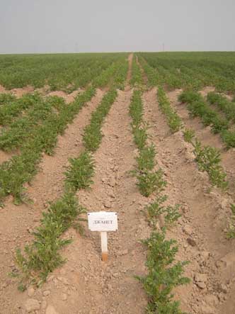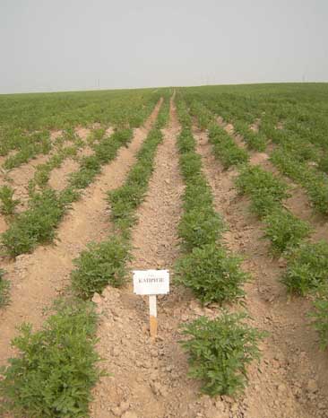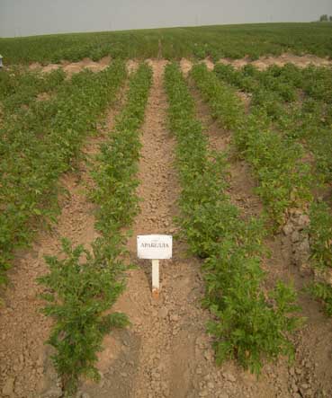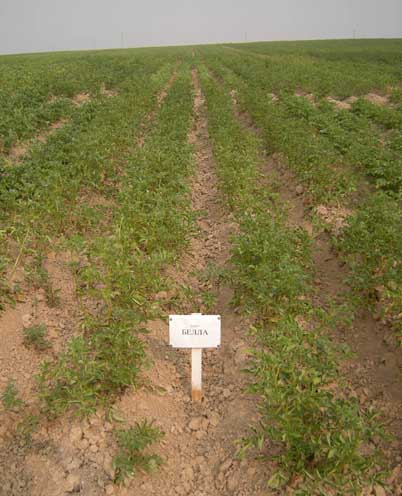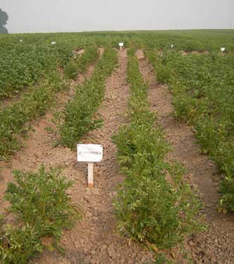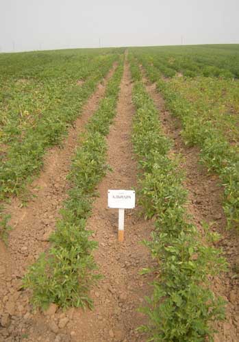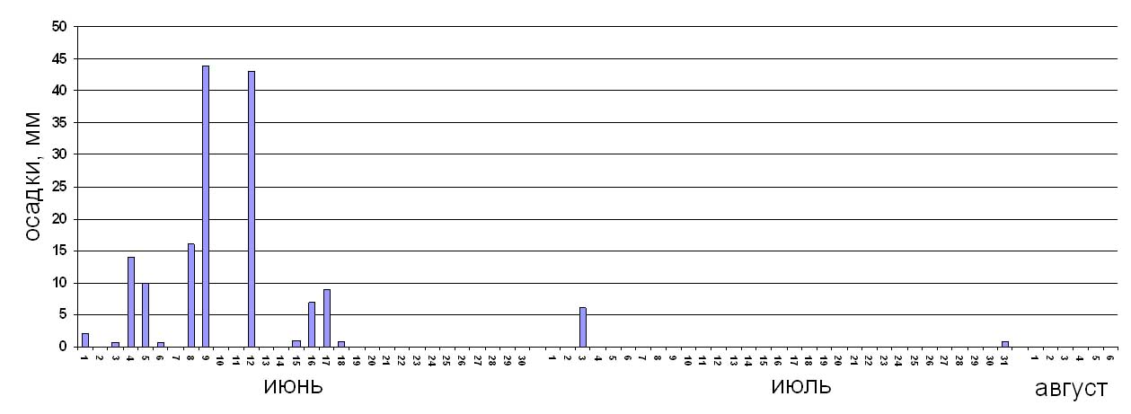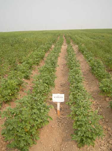 Результаты. В конце июля - начале августа на территории Костромской области стояла очень сухая погода. После сильных дождей в первой половине июня (последний сильный дождь - 17 июня, см. рисунок ОСАДКИ) выпал только небольшой дождь 3 июля. Больше осадков не наблюдалось. Сравнение 39 сортов в условиях засухи выявило различия в их развитии, количестве клубней на куст и урожайности. Максимальное число клубней отмечено у сортов Жемчужина, Рагнеда, Криница, Бриз; максимальная урожайность - у Ненси, Альвары, Бернадетте, Джанет (все сорта селекции ЗФЛ). Наибольшая доля клубней с израстаниями обнаружена у сортов Арабелла, Тека, Ненси. Хорошим развитием ботвы, большим числом клубней и отсутствием израстания последних отличался белорусский сорт Рагнеда.